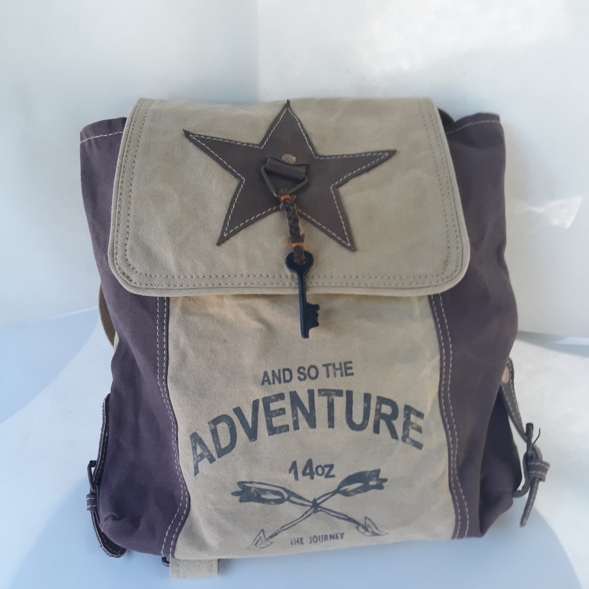 Backpack Canvas with Leather Trim Star on Flap with So The Adventure on the Body Size Width 12" Height 13"