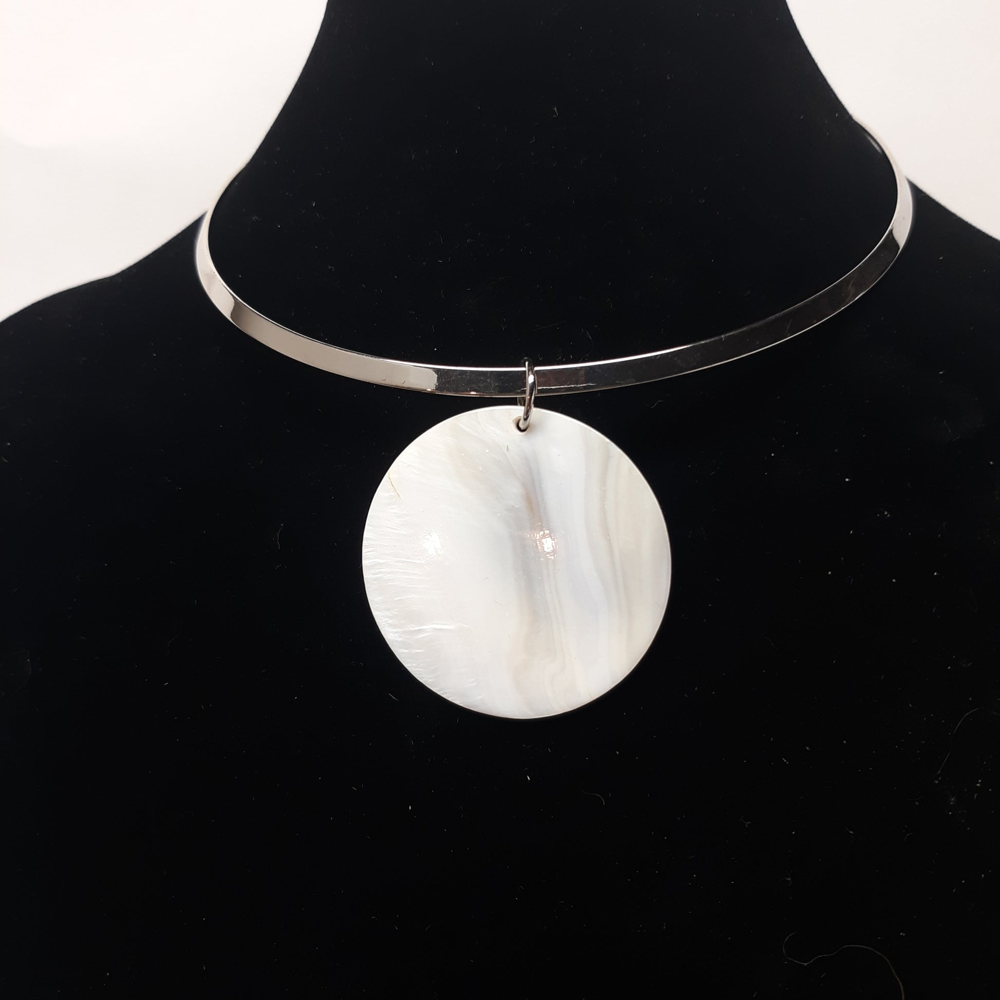 Silver Tone Choker With Natural Shell 3" Disk Style