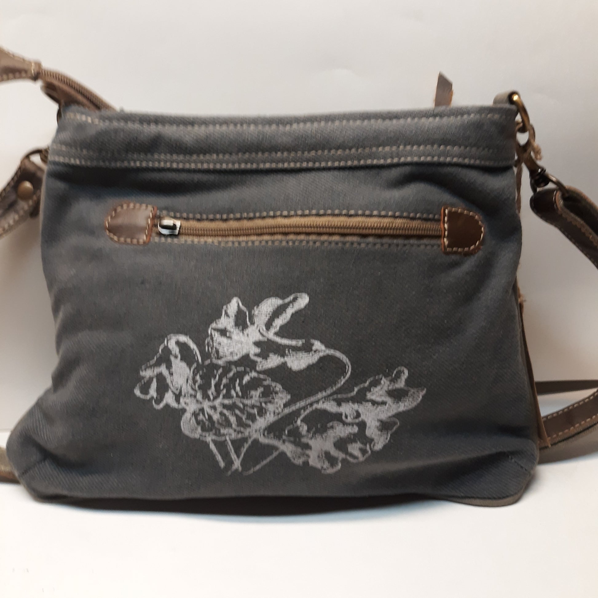 Coss Body Canvass Bag Olive Body with Gray Top Band Back Side Gray with Floral Print Chateau Angludet with Leather Trim Width 11" Height 9 "