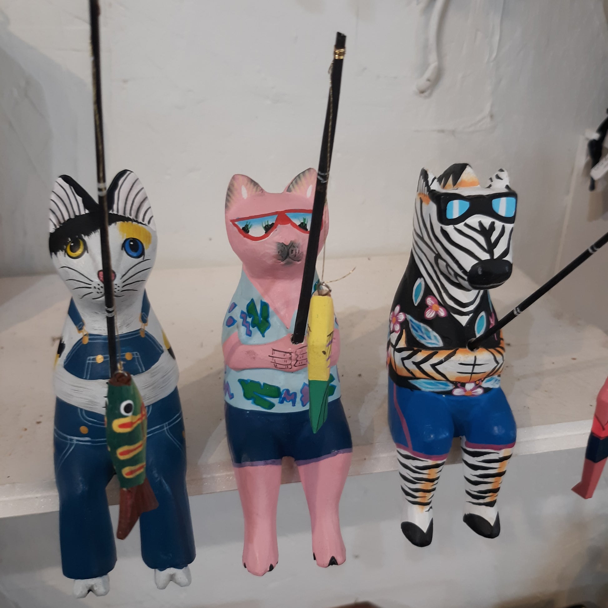 Sitting Fisherman Animals Cat HC105 Dog HC106 Cow. HC107 Zebra HC108 Elephant HC109 Frog HC110 All items Hande Carved and Hand Painted Animals Come assorted Colors Will Vary From Pictures
