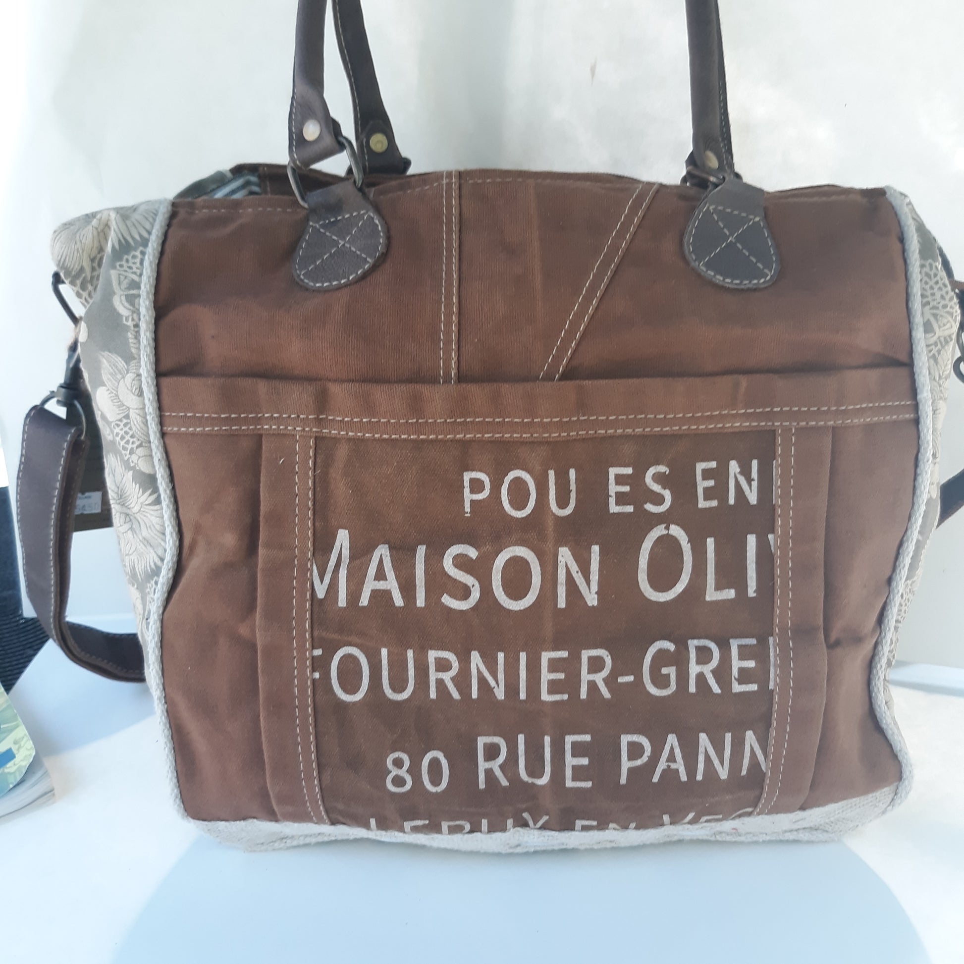 Canvas Shoulder Bag Tote with Leather Trim and Floral Print on Gusset Size Width 15" Height 13 1/2"